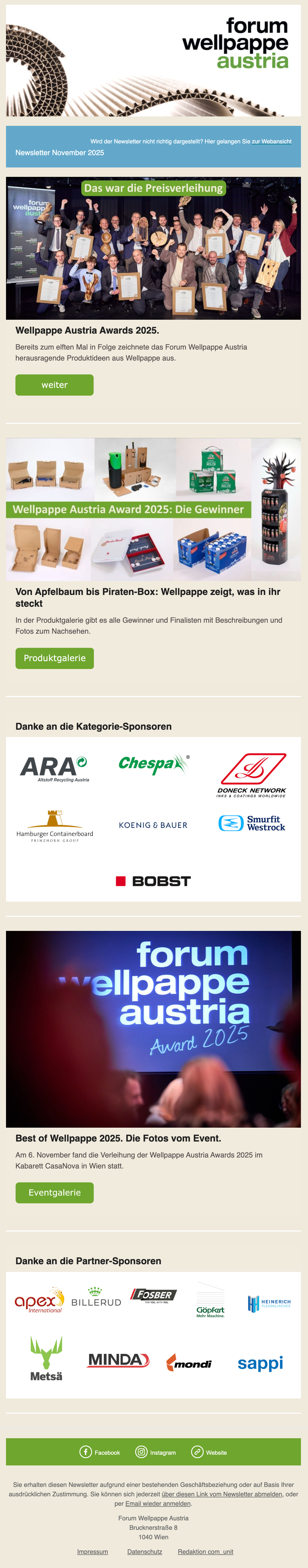 Melden Sie sich hier für den Wellpappe Austria-Newsletter an. Der kostenfreie Newsletter informiert Sie regelmäßig über aktuelle Trends und Entwicklungen aus der Welt der Wellpappe. Den Newsletter können Sie jederzeit einfach abbestellen.