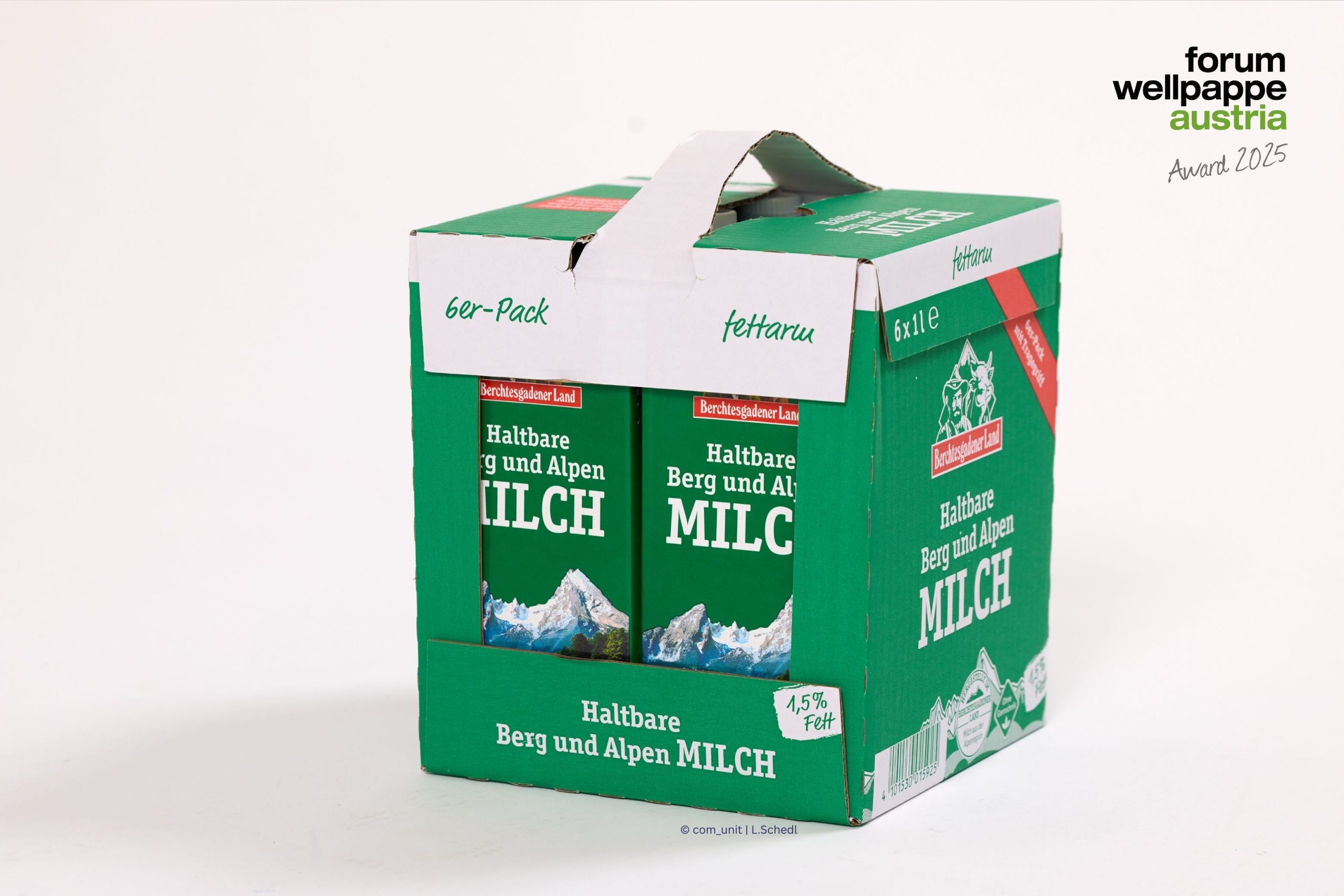 Dieser 6er-Pack für Haltbarmilch kombiniert Funktionalität und Design. Der praktische Griff sorgt für bequemes Tragen. Anders als folierte Multi-Packs setzt diese Lösung auf 100 Prozent Wellpappe und ist damit vollständig recyclingfähig. Der hochwertige Druck hebt den Markenwert des Produkts hervor und macht richtig Lust aufs Mitnehmen. Gewinner Wellpappe Austria Award 2025 in der Kategorie Point of Sale.