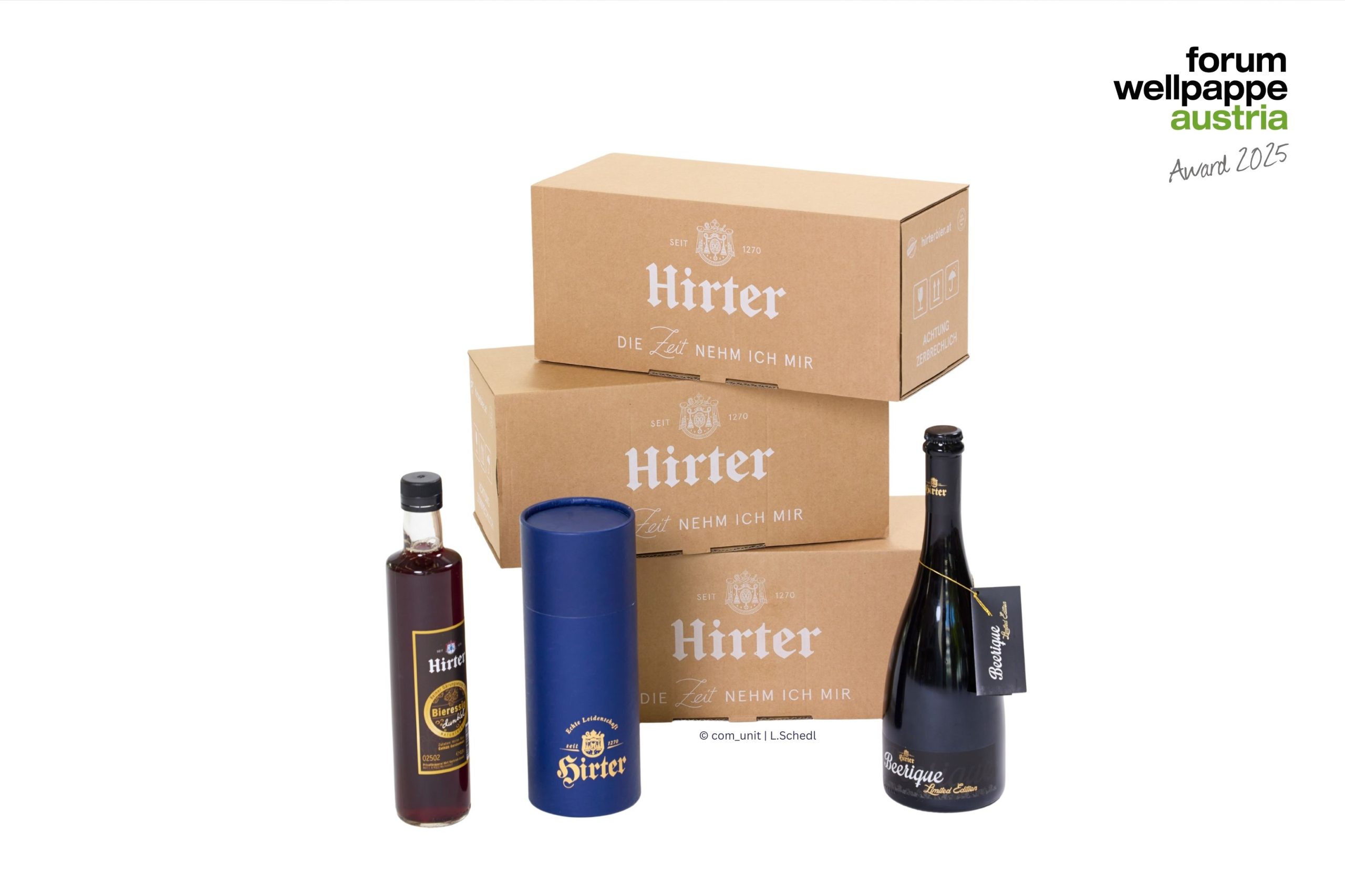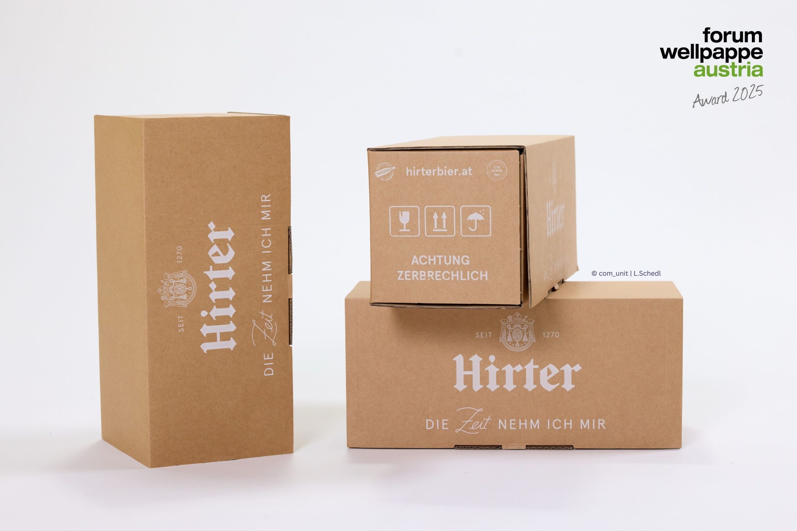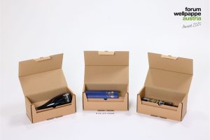 Diese Versandverpackung aus Wellpappe bietet Platz für drei unterschiedliche Flaschengrößen und Formen. Dank Stoßrand und Sicherungslasche sind Bier, Spirituosen und Essig optimal geschützt. Die Verpackung wird flach angeliefert, lässt sich im Handumdrehen schnell aufrichten und erleichtert den Abpackprozess. Die großzügigen Flächen bieten ausreichend Platz für Markenbotschaften. Gewinner Wellpappe Austria Award 2025, Kategorie: Kreativ.