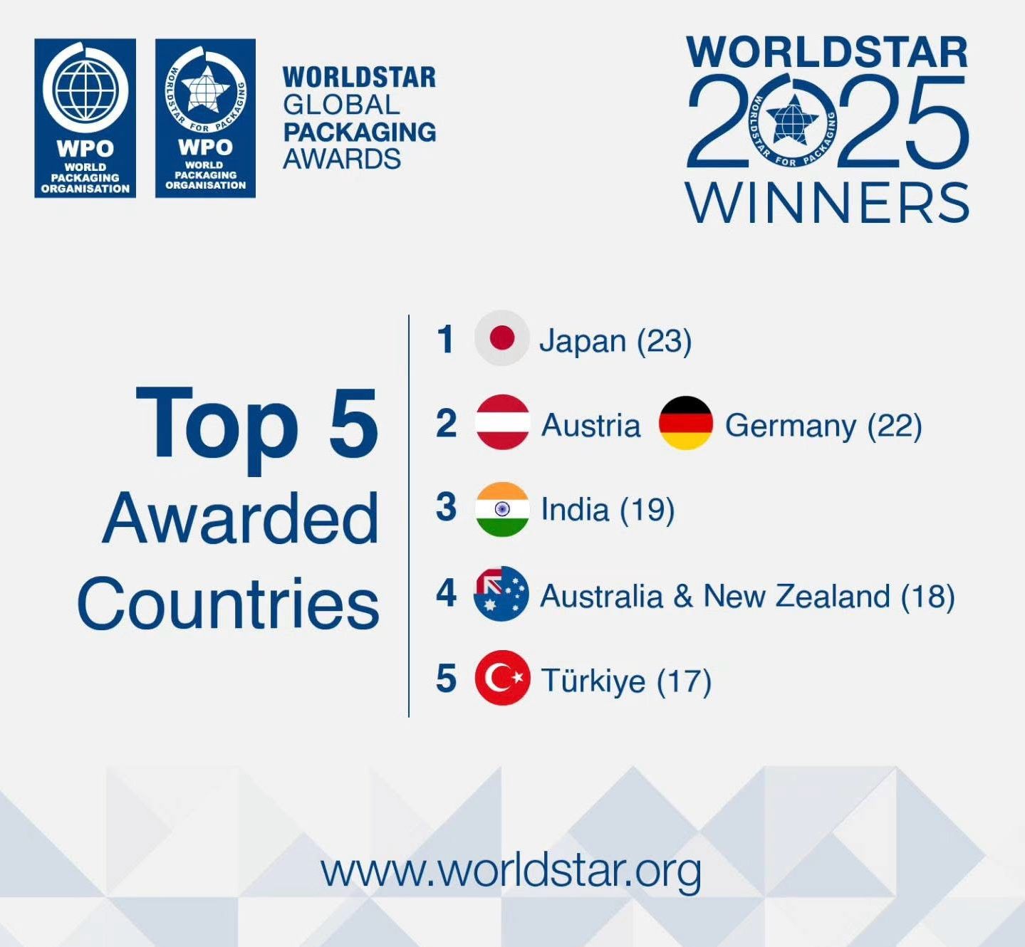 Österreich ist mit 22 Preisen, gemeinsam mit Deutschland, auf Platz zwei der am häufigsten ausgezeichneten Ländern bei den World Stars 2025. Platz eins belegt Japan (23 Awards) und Platz drei Indien (19 Awards).