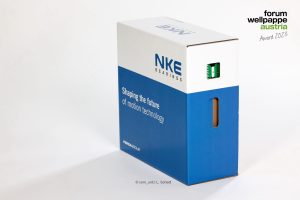 Die Firma NKE AUSTRIA produziert Kugellager für industrielle Anwendungen. Unter anderem für Pumpen und Windräder. Die 20 Kilogramm schweren Kugellager müssen für den Transport in die USA sicher verpackt werden. Sie reagieren sehr empfindlich auf Stöße. Die robuste Konstruktion aus Wellpappe besteht aus Boden, Deckel und mehreren Einlagen. Eine weitere Besonderheit ist der an der Außenseite eingebaute digitale Sensor. Er misst die Belastungen der Verpackung während des Transports. NKE Hybrid Bearings Box: Gewinner, Wellpappe Austria Award 2023, Kategorie: konstruktiv