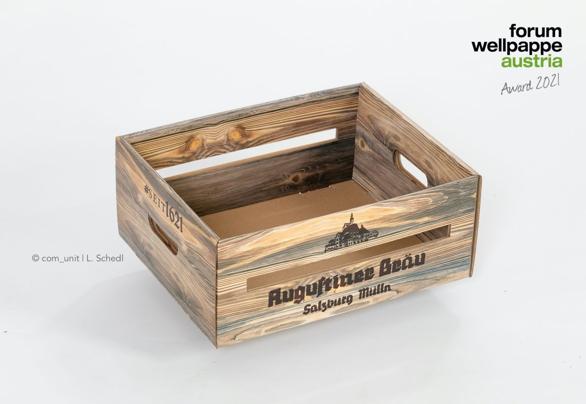 Mit Wellpappe gegen die Rohstoffkrise. Zum 400-jährigen Jubiläum von Augustiner-Bräu entstand die Idee zu einer Bierkiste aus nachhaltiger Wellpappe. Die Lösung: Eine Nostalgie-Bierkiste aus stabiler Wellpappe im Look einer alten Holzkiste. Mit Platz für 20 Bierflaschen. Eine echte Alternative zur herkömmlichen Bierkiste aus Kunststoffgranulat. Nostalgie Bierkiste: Nominierung des Wellpappe Austria Award 2021, Kategorie nachhaltig.