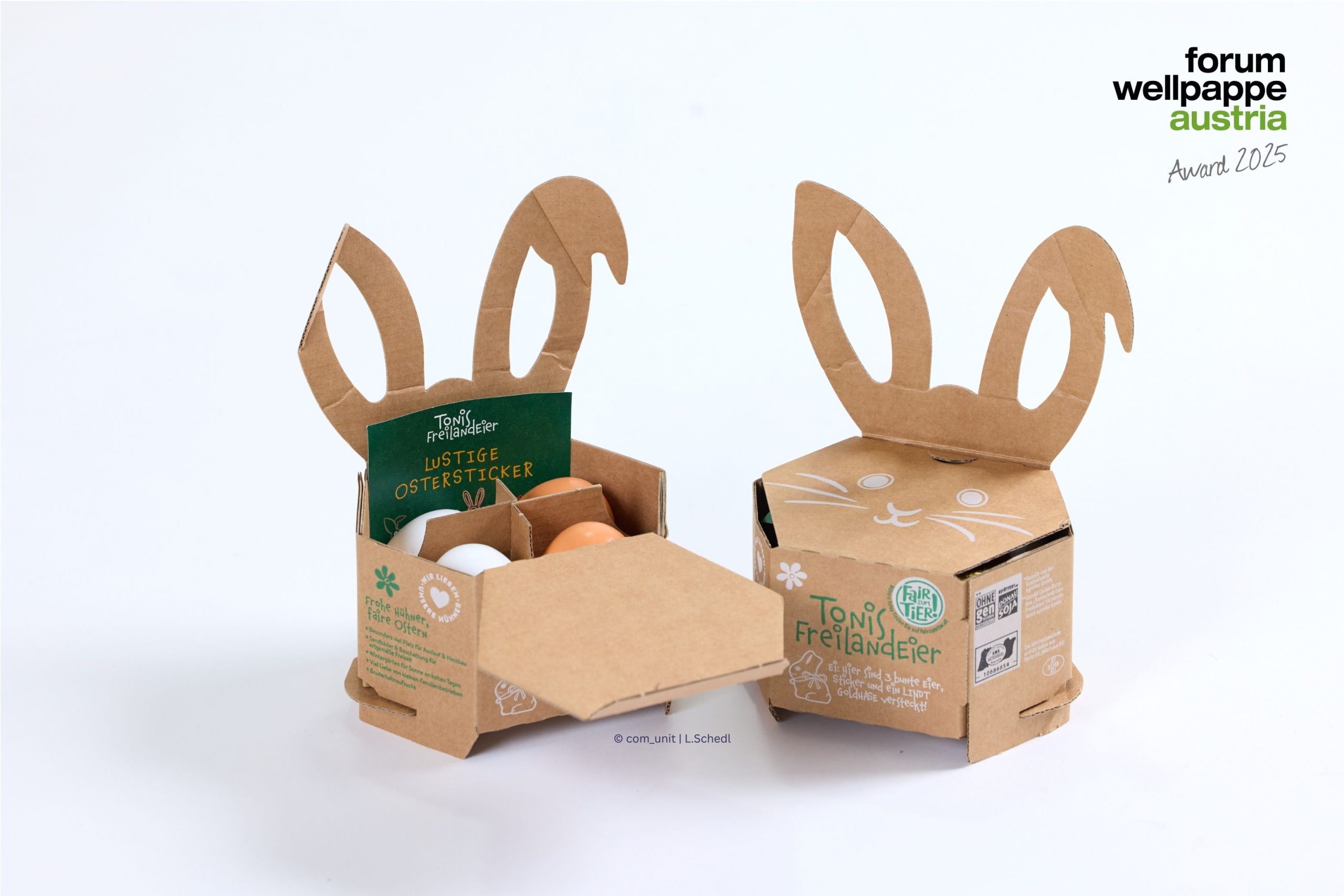 Diese clevere Eierverpackung wurde speziell für den Handel entwickelt. Die Konstruktion besteht aus einem gestanzten Wellpappeteil und einem Fachwerk und kommt ohne Klebung aus. Die Box lässt sich mit nur wenigen Handgriffen leicht aufrichten und überrascht mit einem Wow-Effekt. Öffnet man den integrierte Crowner, wachsen zwei dekorative Hasenohren aus der Box. Ein echter ‚Ei-Catcher‘ am Ostertisch. Nominiert für den Wellpappe Austria Award 2025, Kategorie: Konstruktiv.